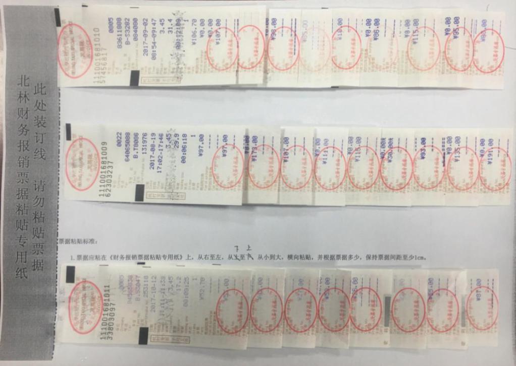 6.出租车发票 按照发票金额从小到大,横向“鱼鳞片”贴票法粘贴于专用纸上。两张票据之间间隔大于1cm。列数不超过3列,每行发票粘贴数量不超过10张,(即每张专用纸上所粘贴的出租车发票数量不超过30张),粘贴时应将出租车车票金额露出,注意不得对出租车票发票专用章进行裁剪(可以折叠)。一张专用纸上所贴出租车发票对应填写一张交通费报销清单(计财处网站上下载)。乘坐出租车时产生的过路费粘贴在对应出租车票后边。