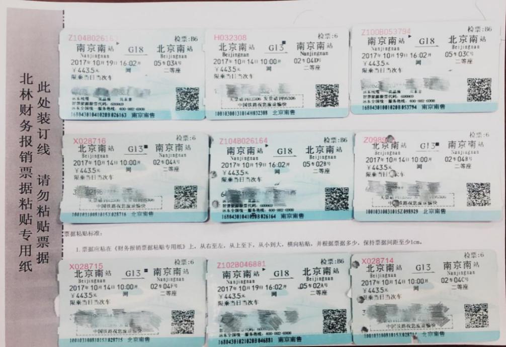 4.定额发票(含市政交通一卡通充值票、保险费定额发票等) 采用“鱼鳞片”贴票法,横向粘贴于专用纸上。两张票据之间间隔大于1cm。粘贴后边界不超过A4专用纸。 5.火车票、汽车票 按差旅行程往返顺序,横向平铺粘贴于专用纸上。车票不能使用订书机装订。每行火车票粘贴数量不超过3张,不超过3列。