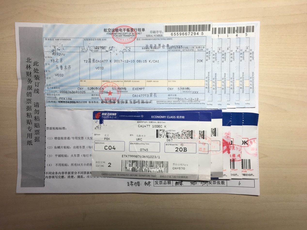 小发票(背面) 3.机票行程单及登机牌 按照差旅行程往返顺序,分两行,采用“鱼鳞片贴票法”横向粘贴于专用纸上。两张票据之间间隔大于1cm。每张专用纸上粘贴行程单数量不超过6张。上一行粘贴行程单,下一行粘贴对应行程单登机牌。(若登机牌为补打的客票使用证明,则使用A4纸打印,按照行程单贴票顺序附在行程单后,不用粘贴)